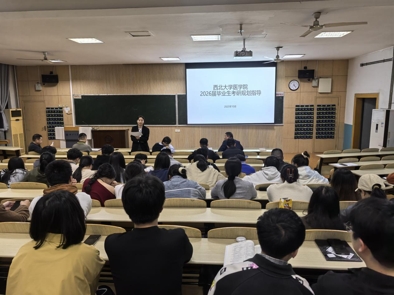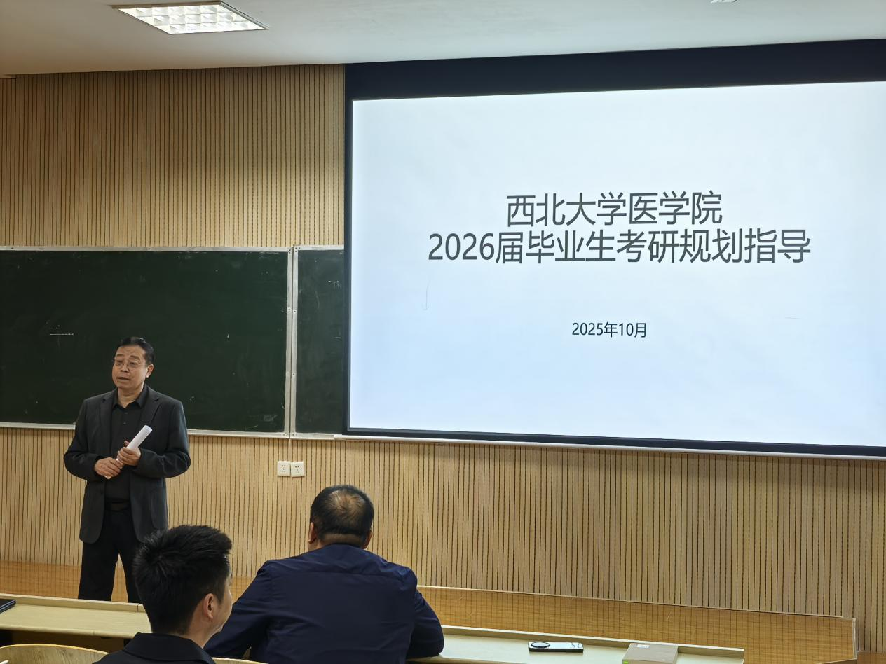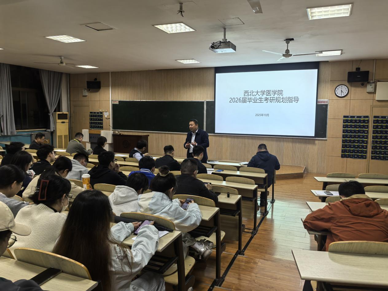 为进一步提升学院2026届毕业生升学率,帮助毕业生清晰了解政策,科学规划,2025年10月15日,医学院在7207教室举办2026届毕业生考研宣讲会。院长赵钢、党委书记王向旭、毕业班班主任陈协群、冯雪、张晓军、赵德志、彭一钊及毕业班辅导员、全体考研同学参加会议。学院党委副书记杨涛主持宣讲会。